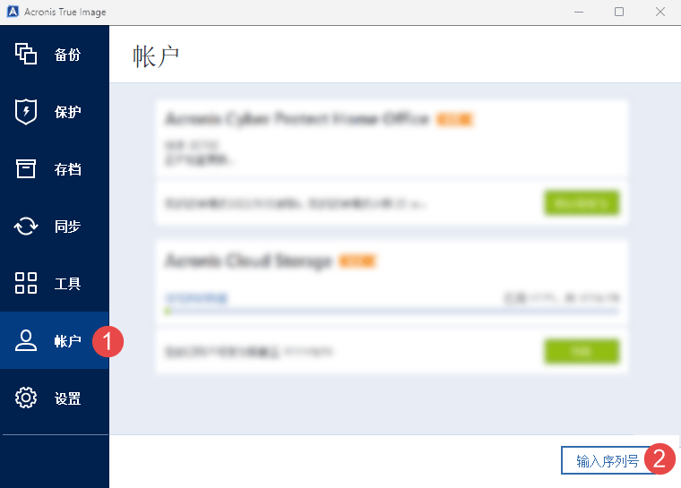 一、运行 Acronis True Image 软件后,在左侧菜单栏依次点击「帐户 > 输入序列号」按钮;