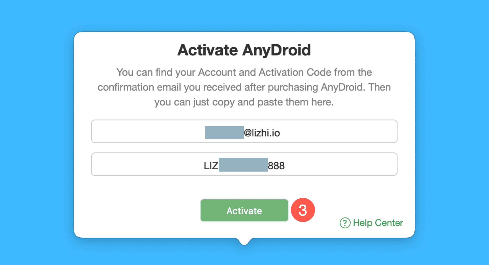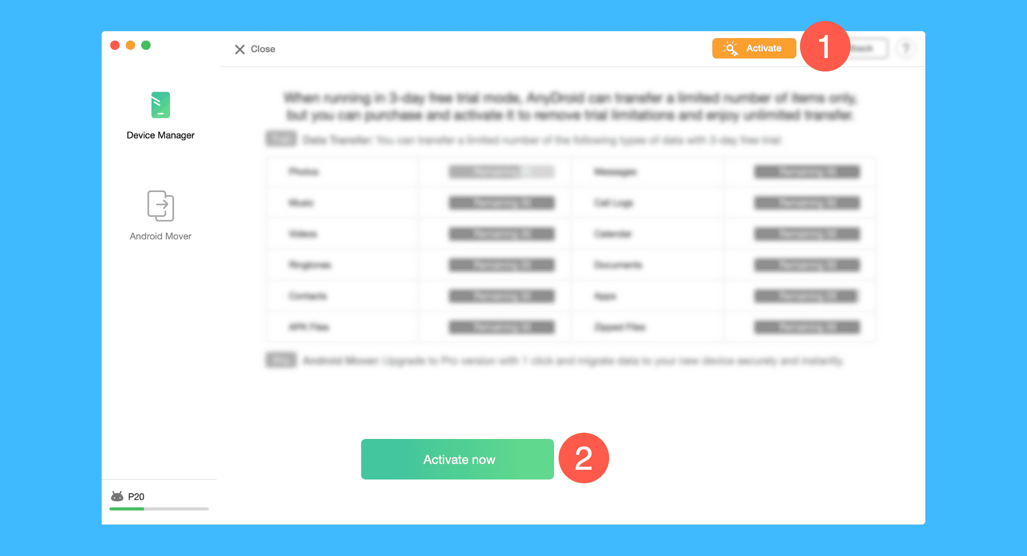 一、运行 AnyDroid 后,依次点击右上角的「Activate > Activate now」按钮: