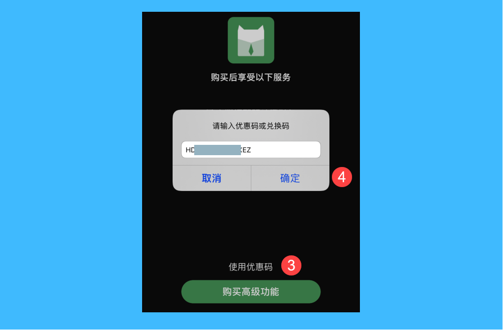 二、在打开页面的底部点击「使用优惠码」,将授权码粘贴输入,「确定」即可解锁全部功能。