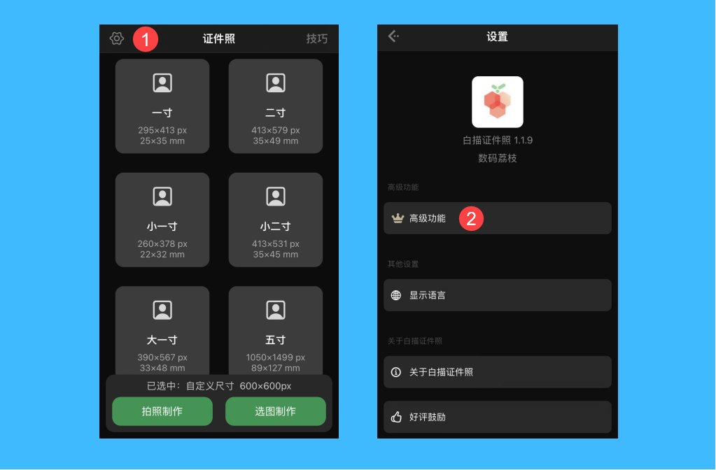 支持制作一寸、二寸、小一寸等多种标准尺寸的高清证件照,可按需自定义尺寸