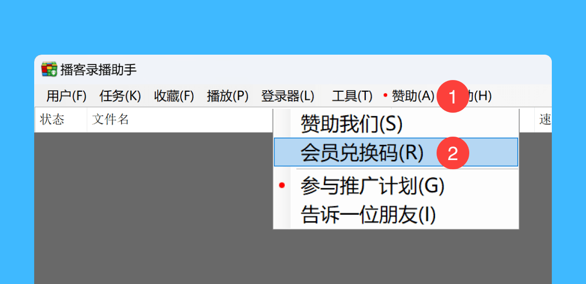一、运行播客录播助手后,依次点击「赞助 > 会员兑换码」按钮;