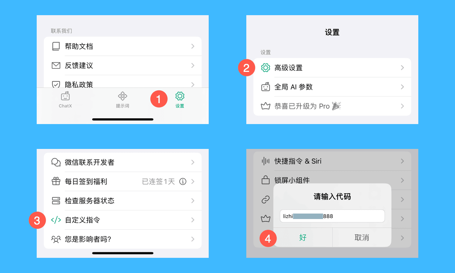 运行 ChatX 后,依次点击「设置 > 高级设置 > 自定义指令」,粘贴激活码后点击「好」,即可增加相应数量的聊天字数。