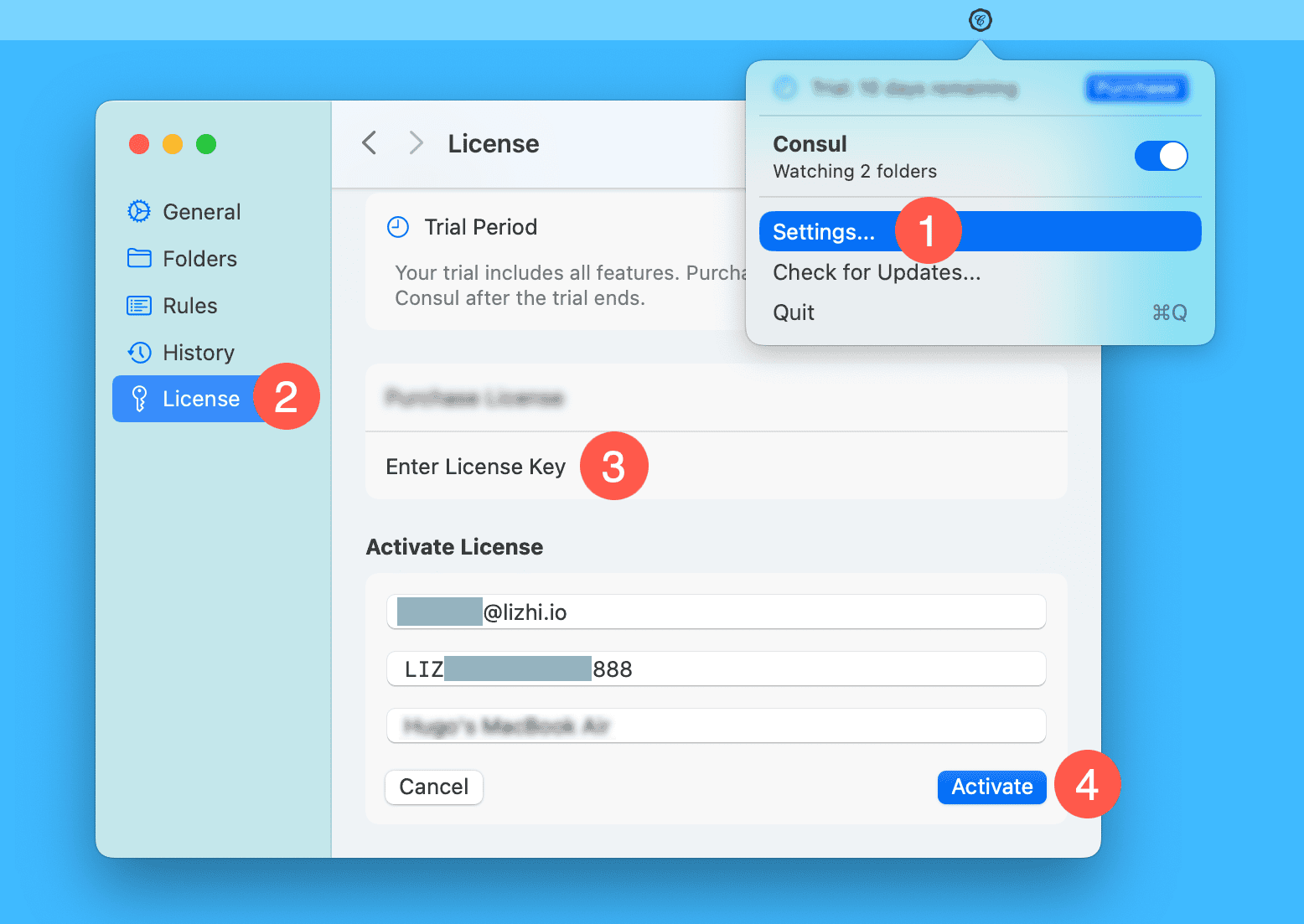 运行 Consul,依次点击菜单栏「软件图标 > Settings… > License > Enter License Key」按钮,输入邮箱并粘贴激活码,点击「Activate」即可完成激活。