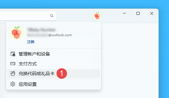 一、在微软商店登录账号后,在右上角点击「头像 > 兑换代码或礼品卡」;