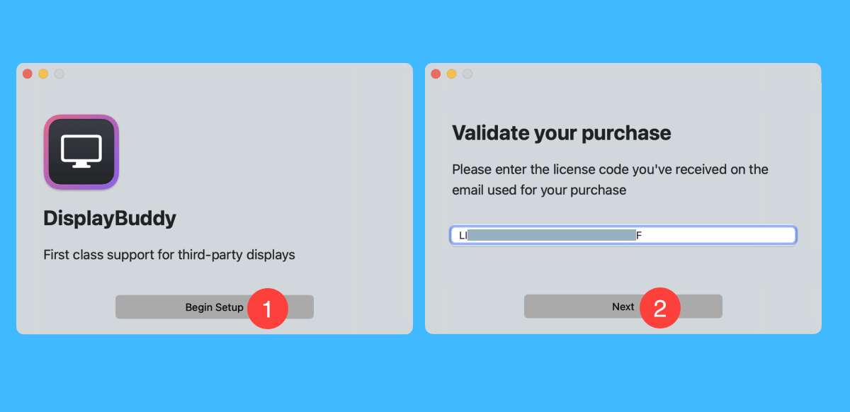 运行 DisplayBuddy 后,点击「Begin Steup」按钮,在弹出的窗口中粘贴激活码即可激活软件。