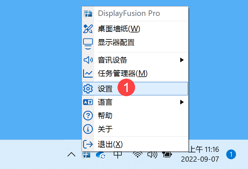一、运行 DisplayFusion,右击托盘中的软件图标并点击「设置」按钮;
