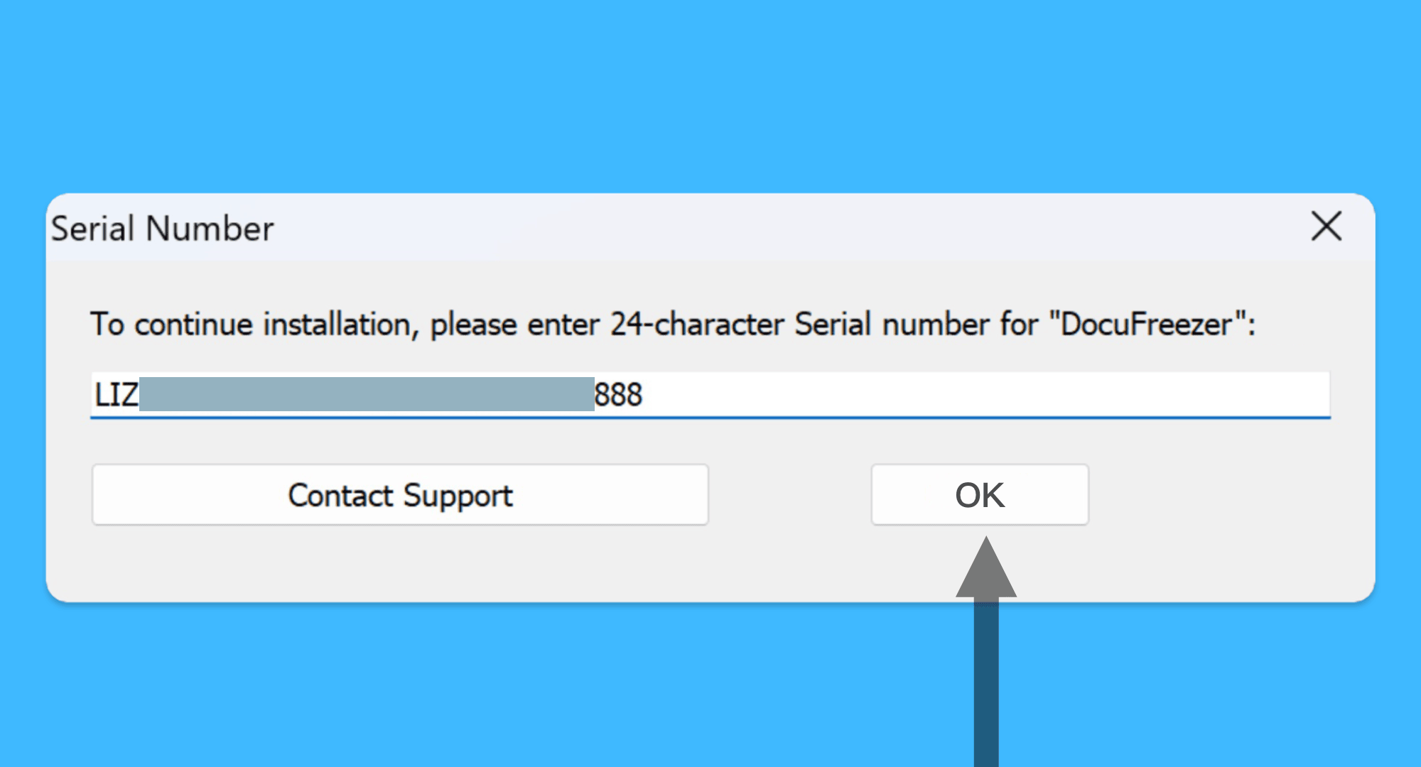 安装商业版 DocuFreezer 时,在输入框粘贴激活码并点击「OK」按钮,待安装结束后运行软件,即可完成激活。