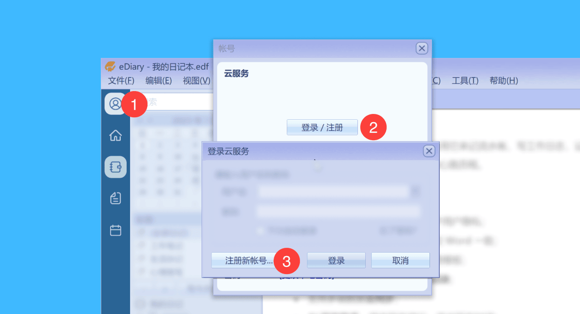 一、运行 eDiary 进入日记本后,依次点击左上角「图标 > 登录 / 注册 > 注册新帐号…」按钮;