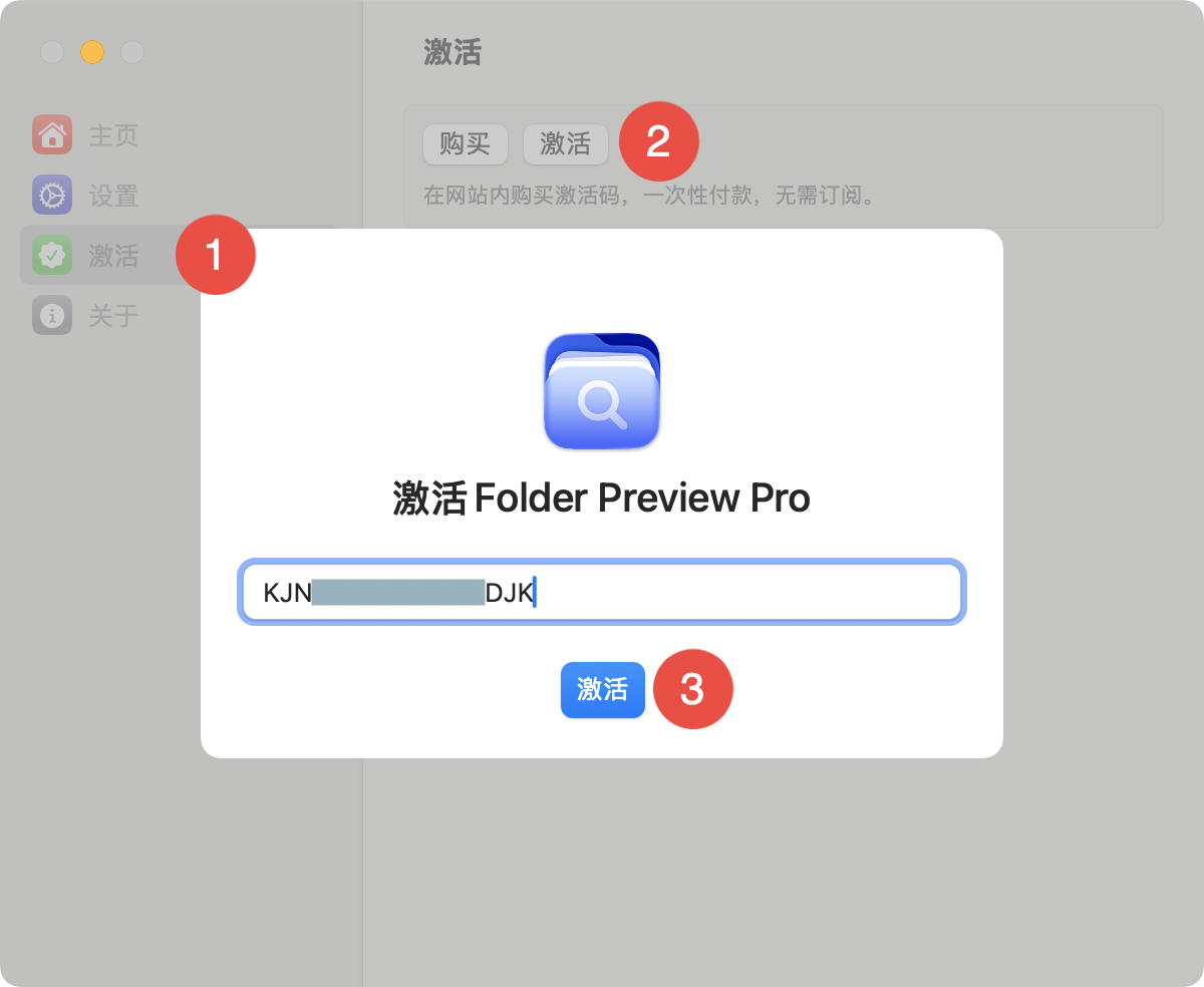 运行 Folder Preview Pro 后,在弹出窗口选择「激活」栏目,点击「激活」按钮,粘贴激活码后点击「激活」即可。
