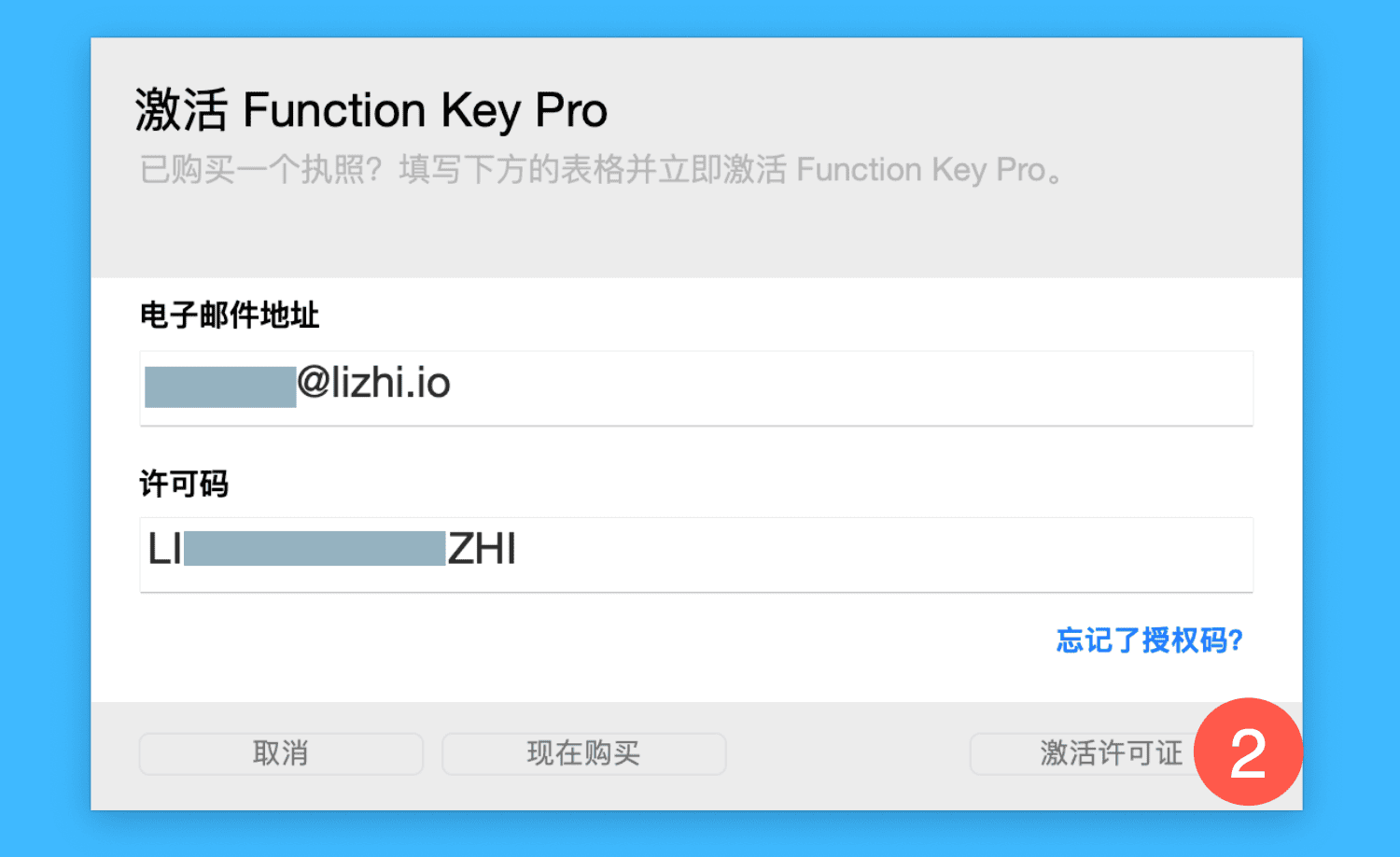 二、在弹窗中填写邮箱并粘贴激活码,点击「激活许可证」即可完成激活。