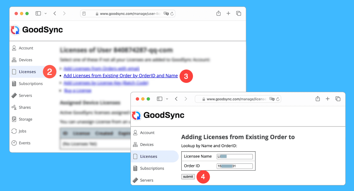 二、登录后,依次点击「Licenses > Add Licenses from Existing Order by OrderID and Name」按钮,输入授权邮件中获得的授权名及 OrderID,并点击「submit」按钮;