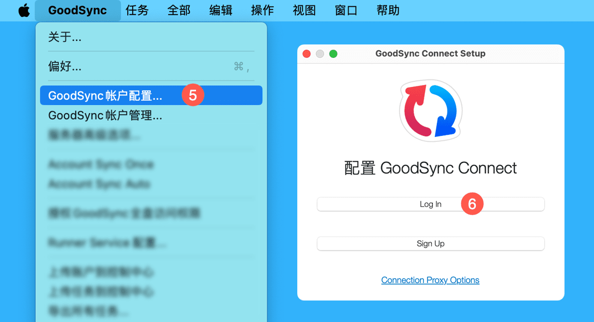 三、运行「GoodSync」,依次点击菜单栏「GoodSync > GoodSync 账号配置… > Log In」,登录你的 GoodSync 账号;