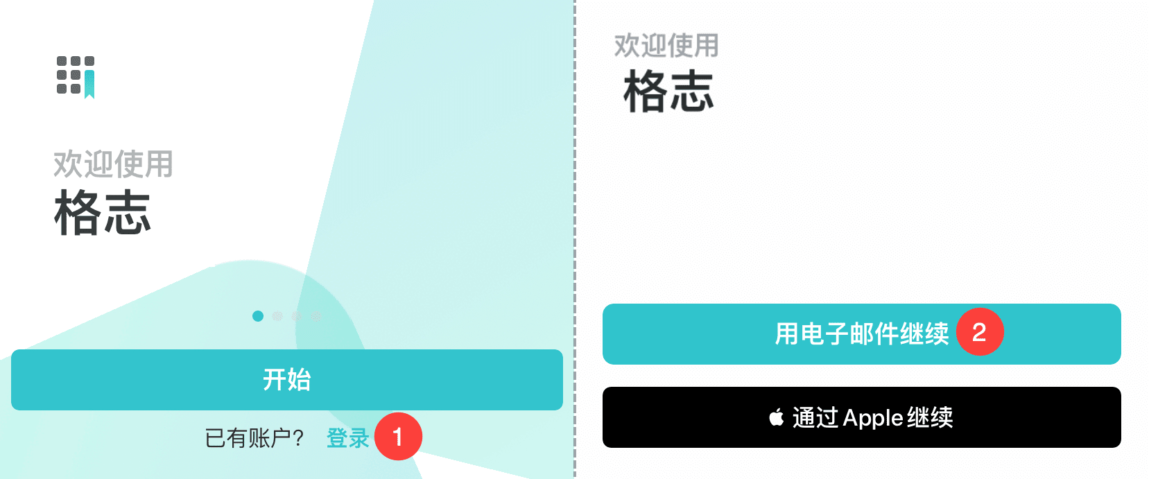 一、如果未注册格志日记账号 (已注册账号直接跳转步骤三),请先打开「格志日记」App,点击底部的「登陆」,选择「用电子邮件继续」;