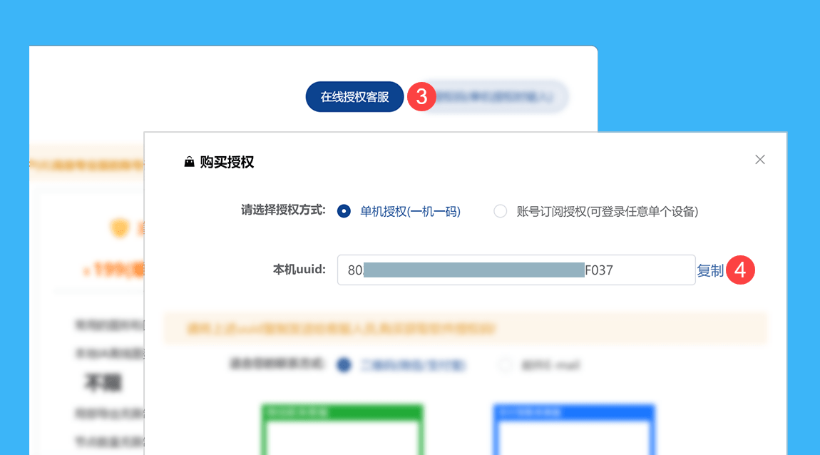 二、点击右上角的「在线授权客服」按钮,复制本机 UUID,并在荔枝商店下单后,粘贴至订单填写页面;