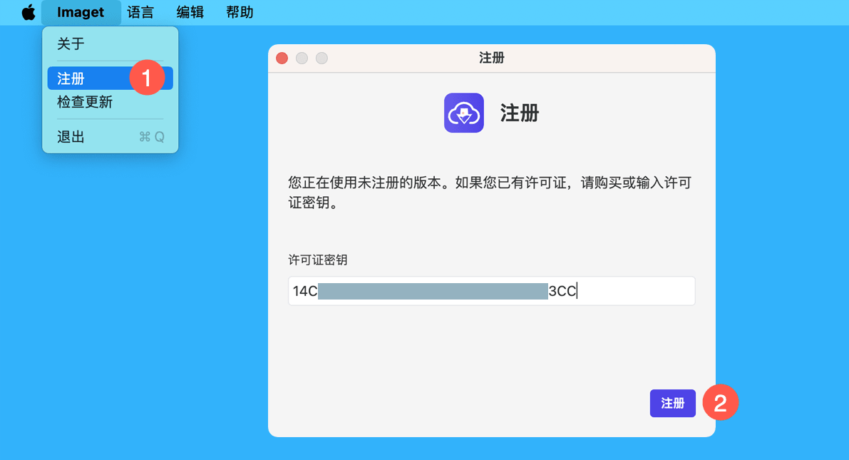 运行 Imaget 后,依次点击菜单栏「Imaget > 注册」按钮,在弹窗中粘贴激活码,点击「注册」即可完成激活。