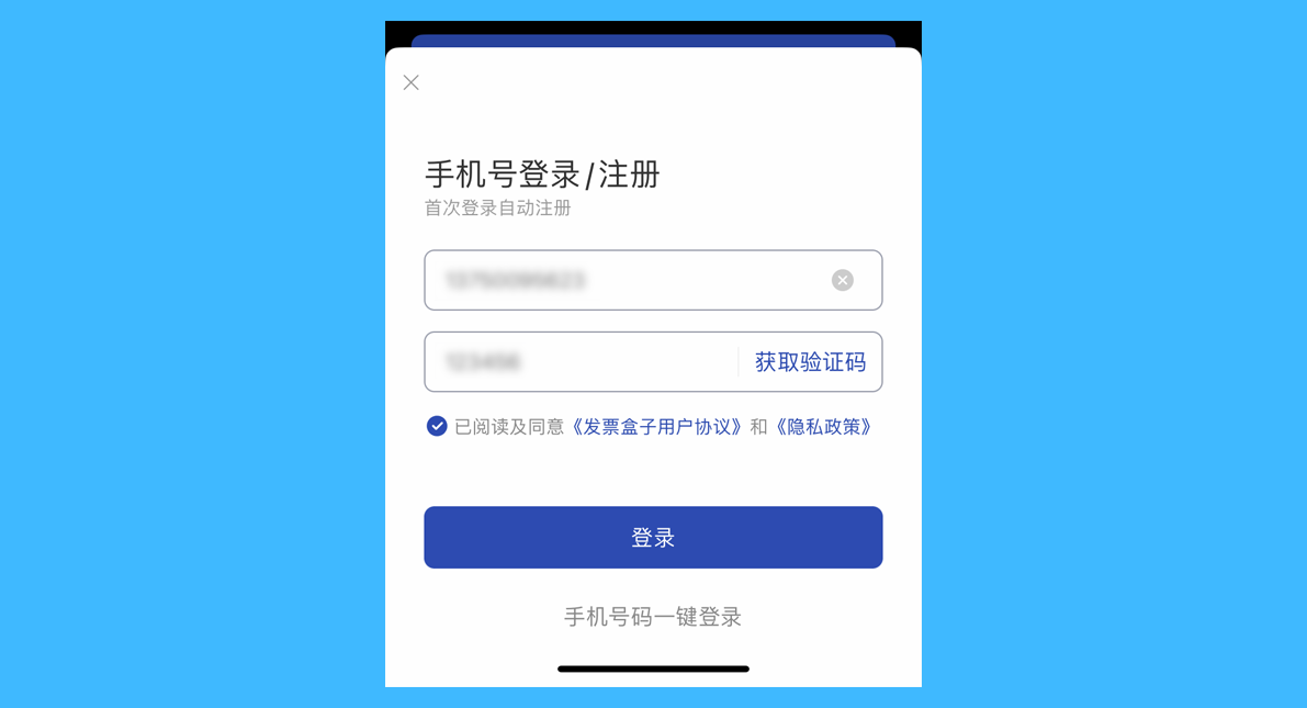 一、运行发票盒子,通过手机号码注册账号并登录: