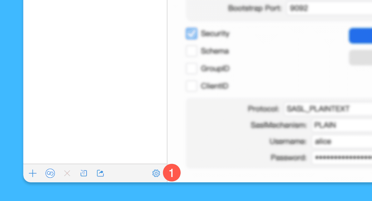 一、运行「Kafka Assistant」后,点击界面左下角的齿轮图标;