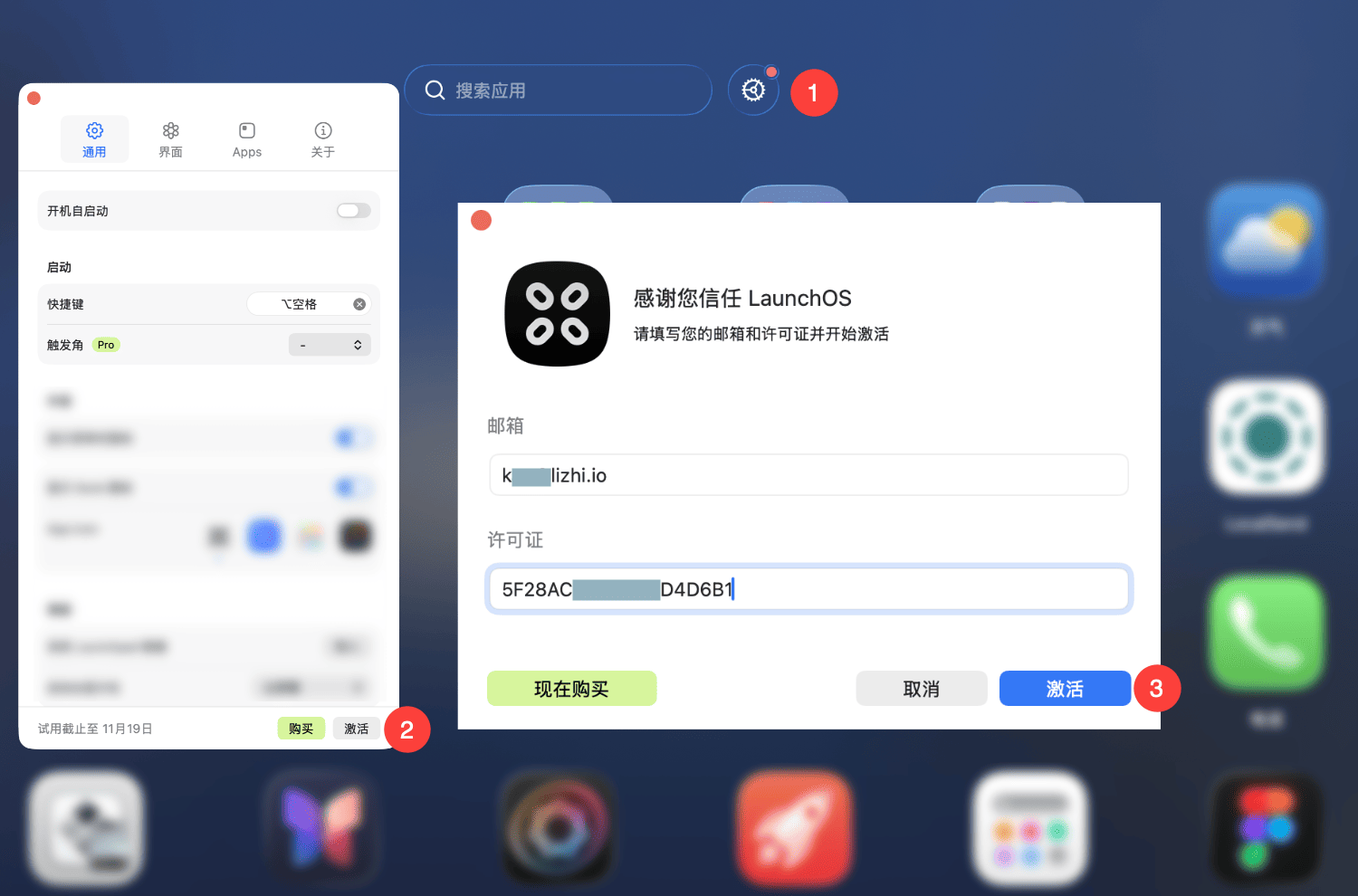 运行 LaunchOS 后,点击左上角「齿轮」按钮,在设置中点击「激活」,跳转新窗口中粘贴邮箱与激活码,点击「激活」即可。