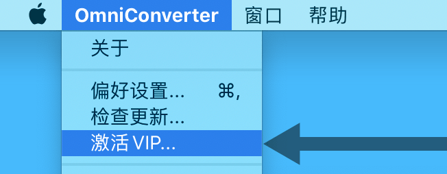 一、运行 OmniConverter 后,依次点击菜单栏「 OmniConverter > 激活 VIP…」按钮;