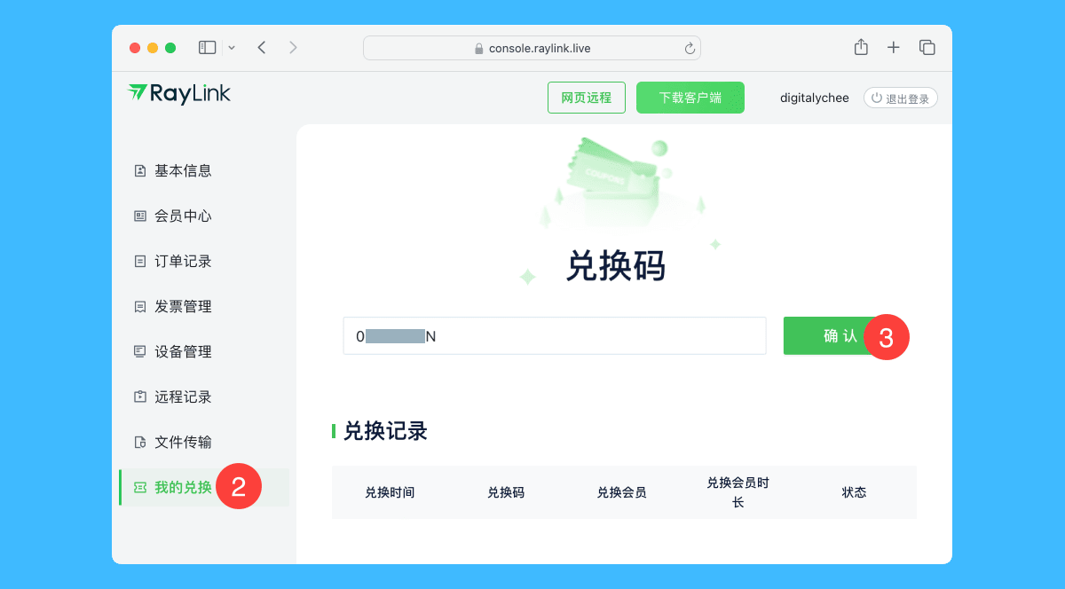 二、点击左侧「我的兑换」按钮,在输入框内粘贴兑换码,点击「确认」即可兑换会员资格。