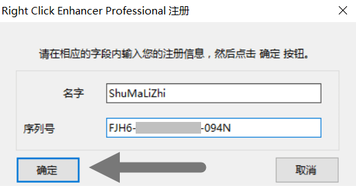 二、如下图,在弹出的窗口中输入您的「名字」和「序列号」, 并单击确认;