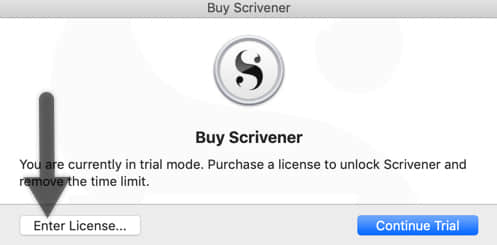 一、启动 Scrivener 软件,依次点击菜单栏「帮助 > 购买 Scrivener」,在弹窗中选择「Enter License」按钮;