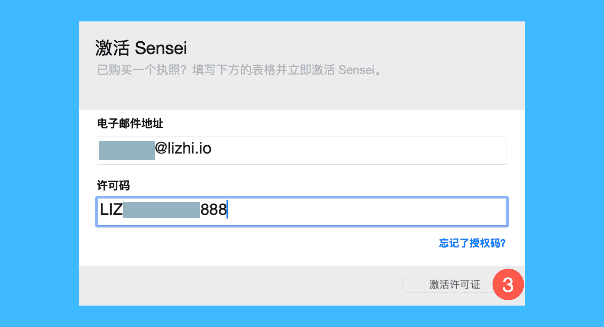 二、在输入框中粘贴邮箱账号和激活码,点击「激活许可证」即可完成激活。