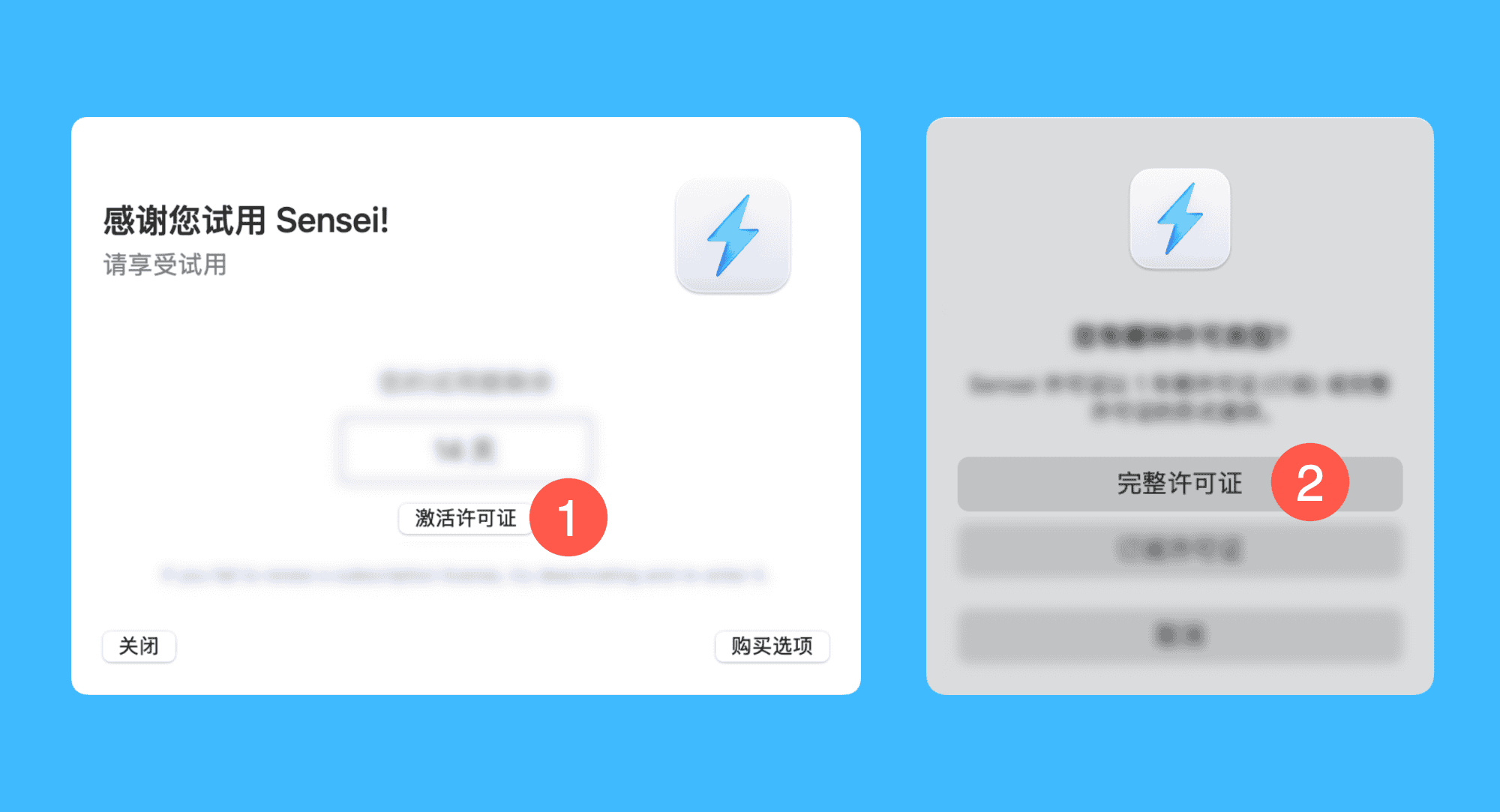 一、运行 Sensei 后,在弹窗内依次点击「激活许可证 > 完整许可证」;