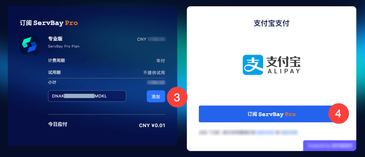 二、登录后在新页面「优惠码」输入框,粘贴兑换码点击「添加」,价格变为 0.01 元后,选择支付宝进行支付,即可完成激活。