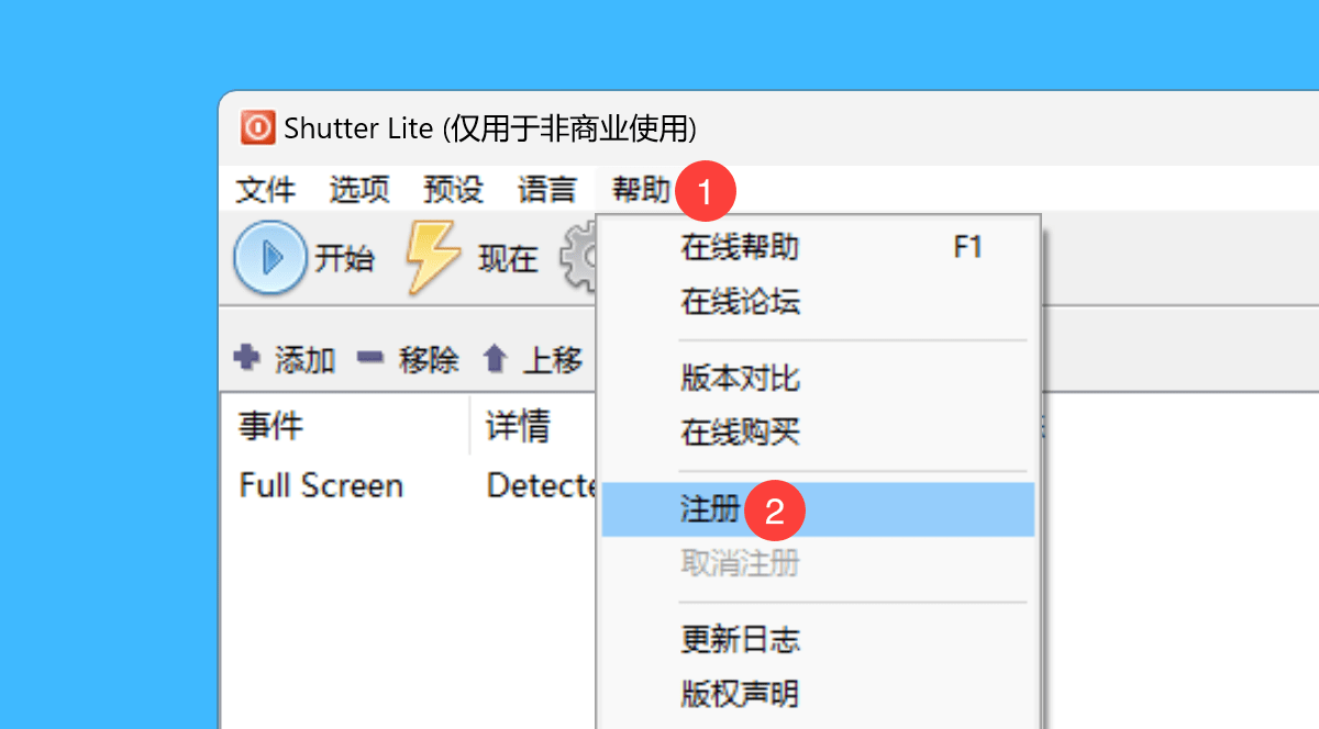 一、运行 Shutter 后,依次点击菜单栏「帮助 > 注册」按钮;