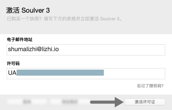 二、在弹出窗口中,输入授权邮件中的邮箱、授权码,最后点击「激活许可证」按钮,完成激活。