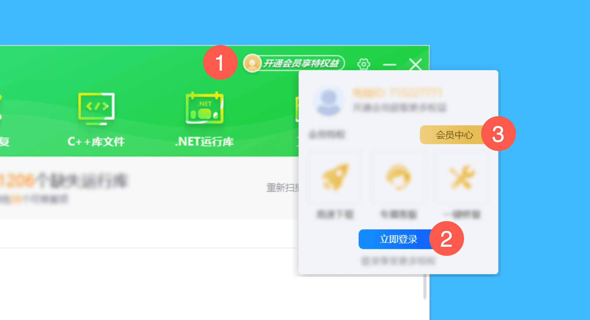 一、运行软件后,依次点击「开通会员享特权益 > 立即登录」按钮,完成账号注册并登录后,点击「会员中心」;