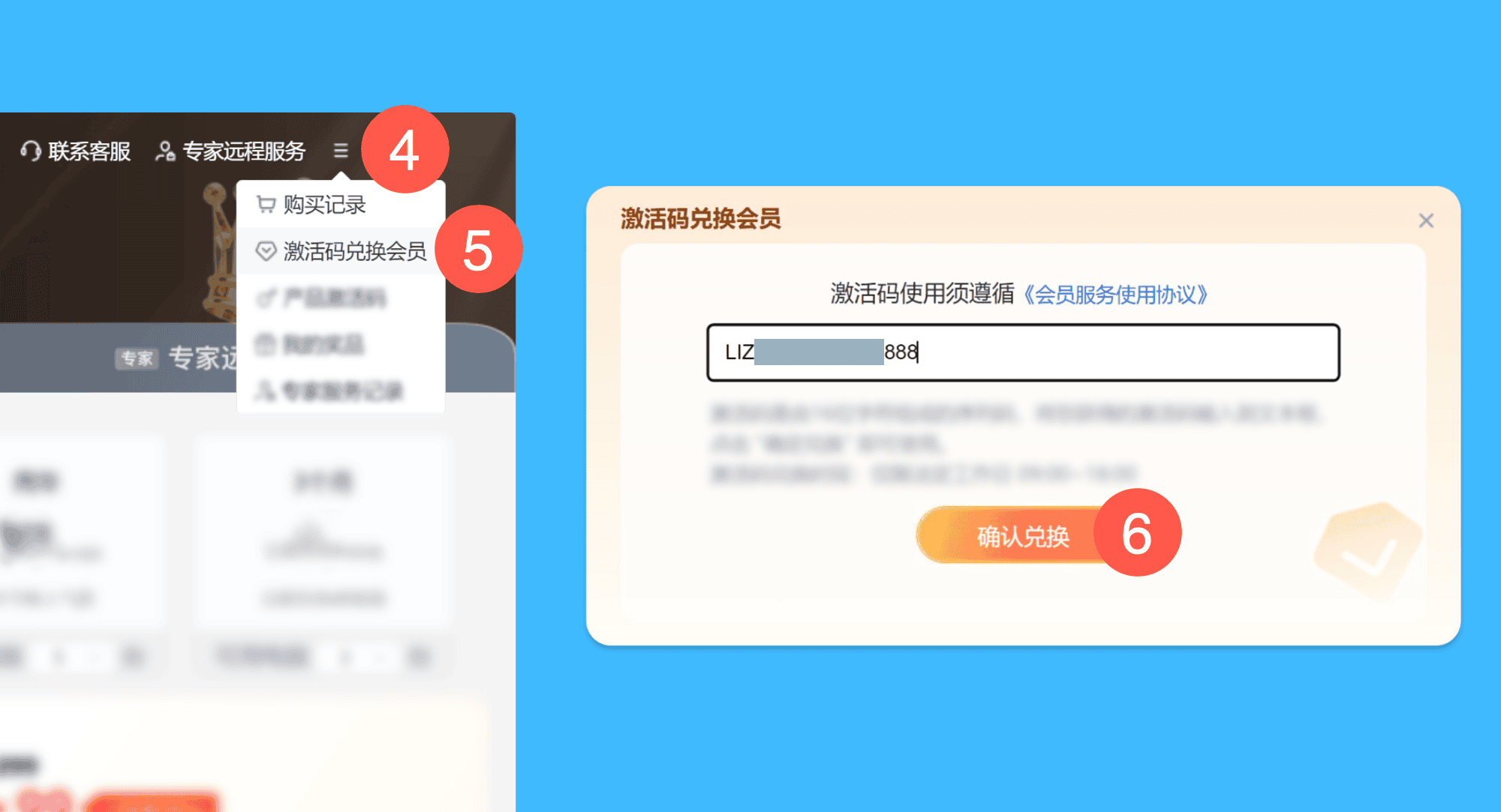 二、依次点击右上角的「菜单键 > 激活码兑换会员」按钮,在弹窗中粘贴激活码,点击「确认兑换」即可完成激活。