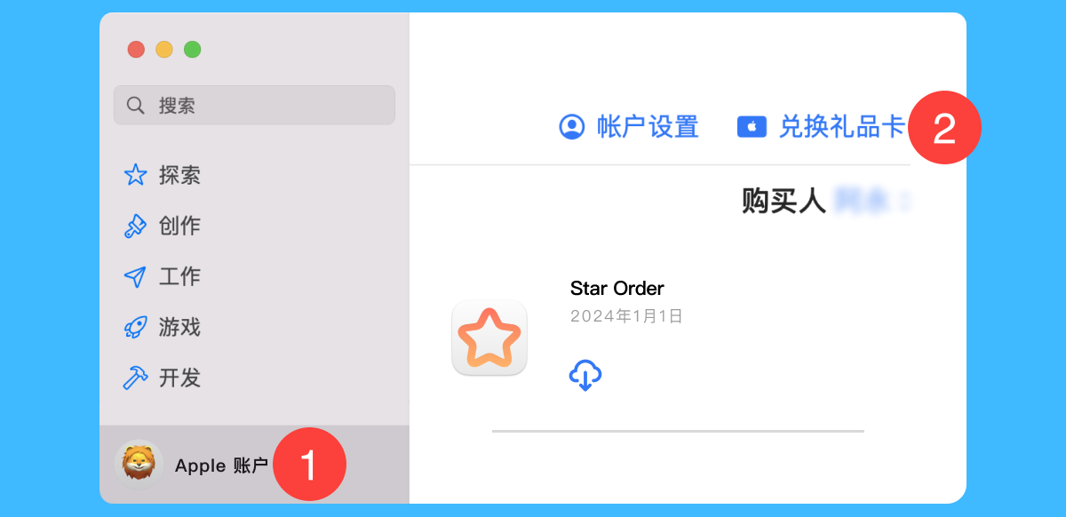 一、运行 Mac App Store 后,依次点击左下角「Apple 账户 > 兑换礼品卡」按钮;