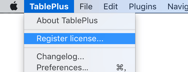 一、运行 TablePlus 软件,并依次点击菜单栏「TablePlus > Register license」选项;