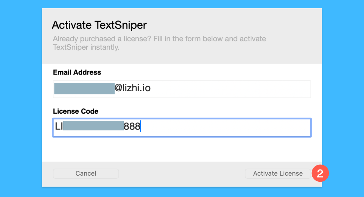 二、在输入框内,填写邮箱账号并粘贴激活码,点击「Activate License」即可完成激活。