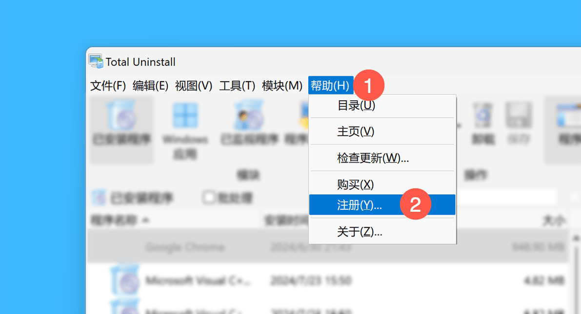一、运行 Total Uninstall 后,依次点击菜单栏的「帮助 > 注册」按钮:
