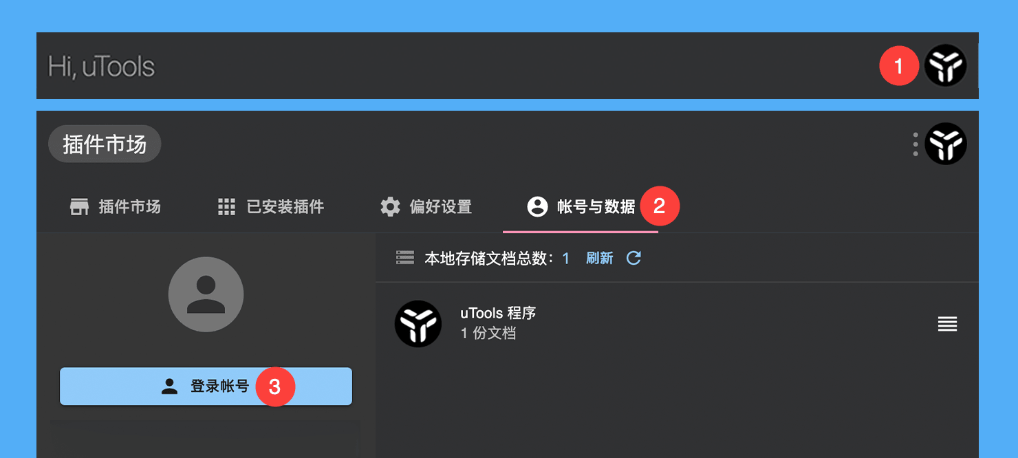 一、启动 uTools 后,使用快捷键 Alt (Option) + 空格呼出窗口,依次点击「右侧图标 > 账号与数据 > 登陆账号」;