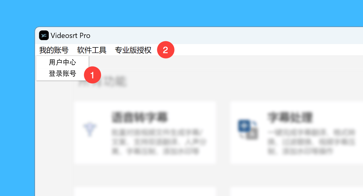 一、运行 Videosrt Pro 软件,点击菜单栏「我的账号 > 登陆账号」进行注册并登陆,再点击「专业版授权」按钮;