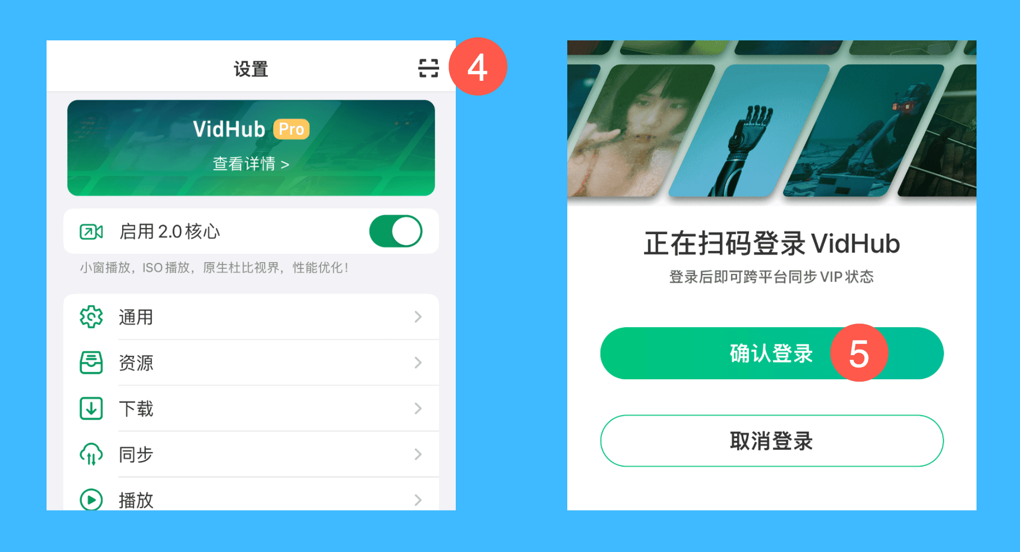 三、在 VidHub 应用内,点击右上角的扫码按钮,扫描上述二维码,并点击「确认登录」;