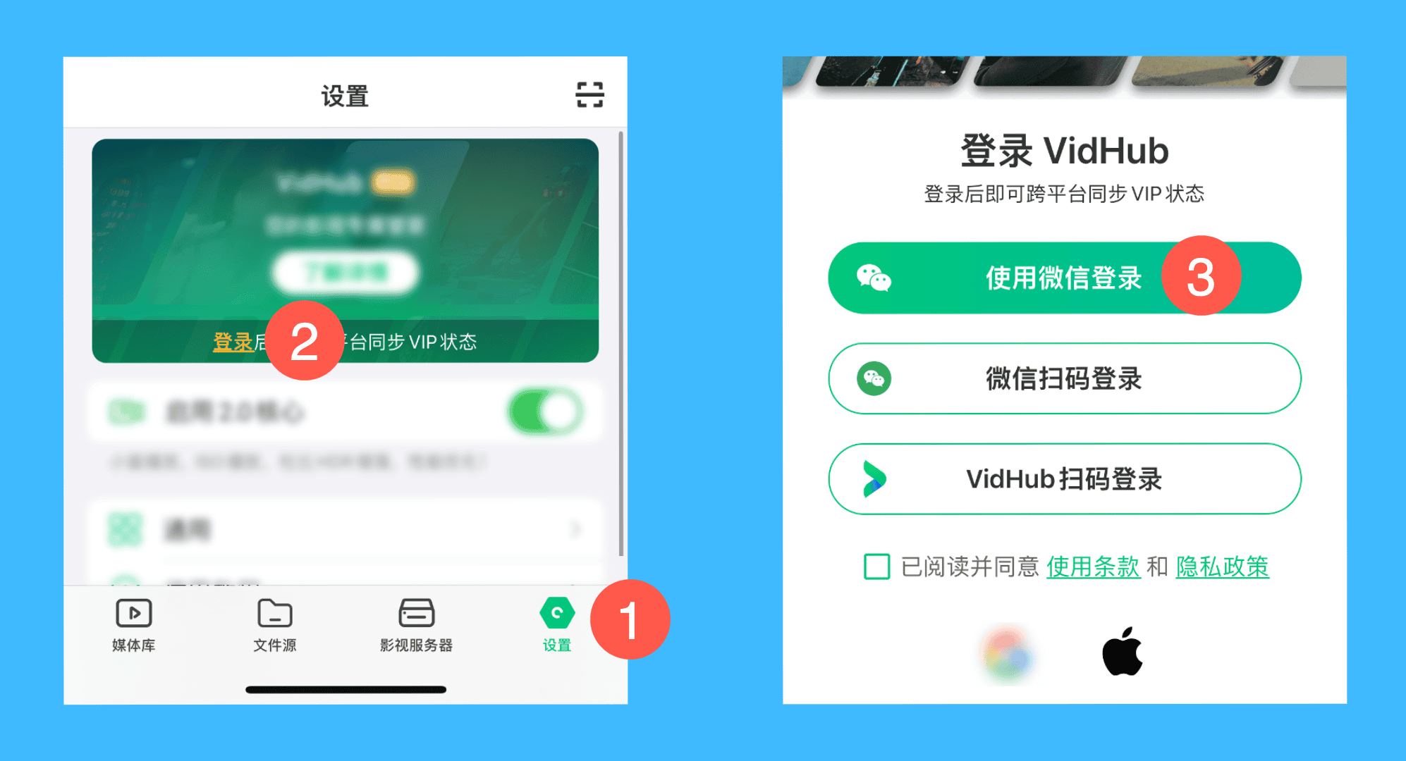 一、在手机上运行 VidHub,依次点击「设置 > 登录」,完成账号注册并登录;