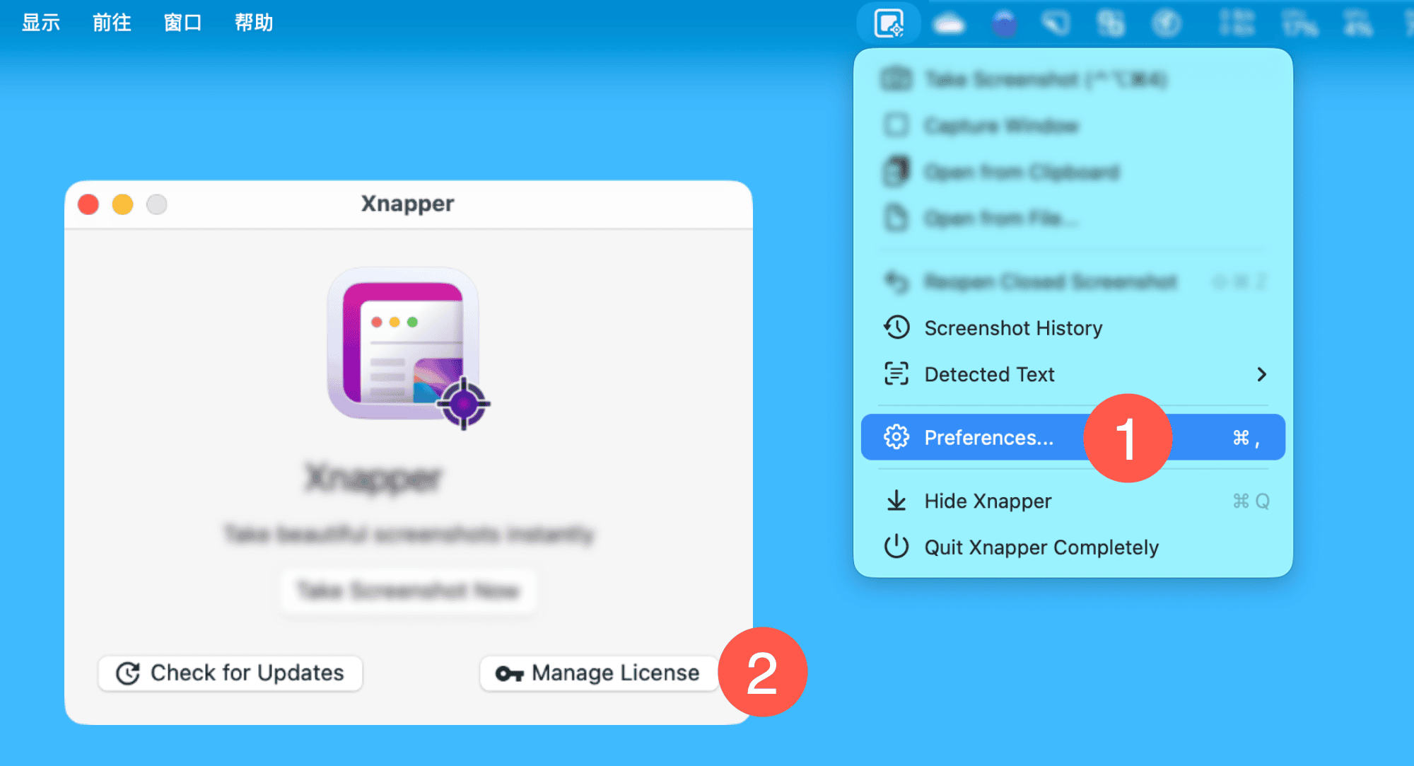 一、运行 Xnapper 后,依次点击菜单栏「软件图标 > Preferences… > Manage License」按钮: