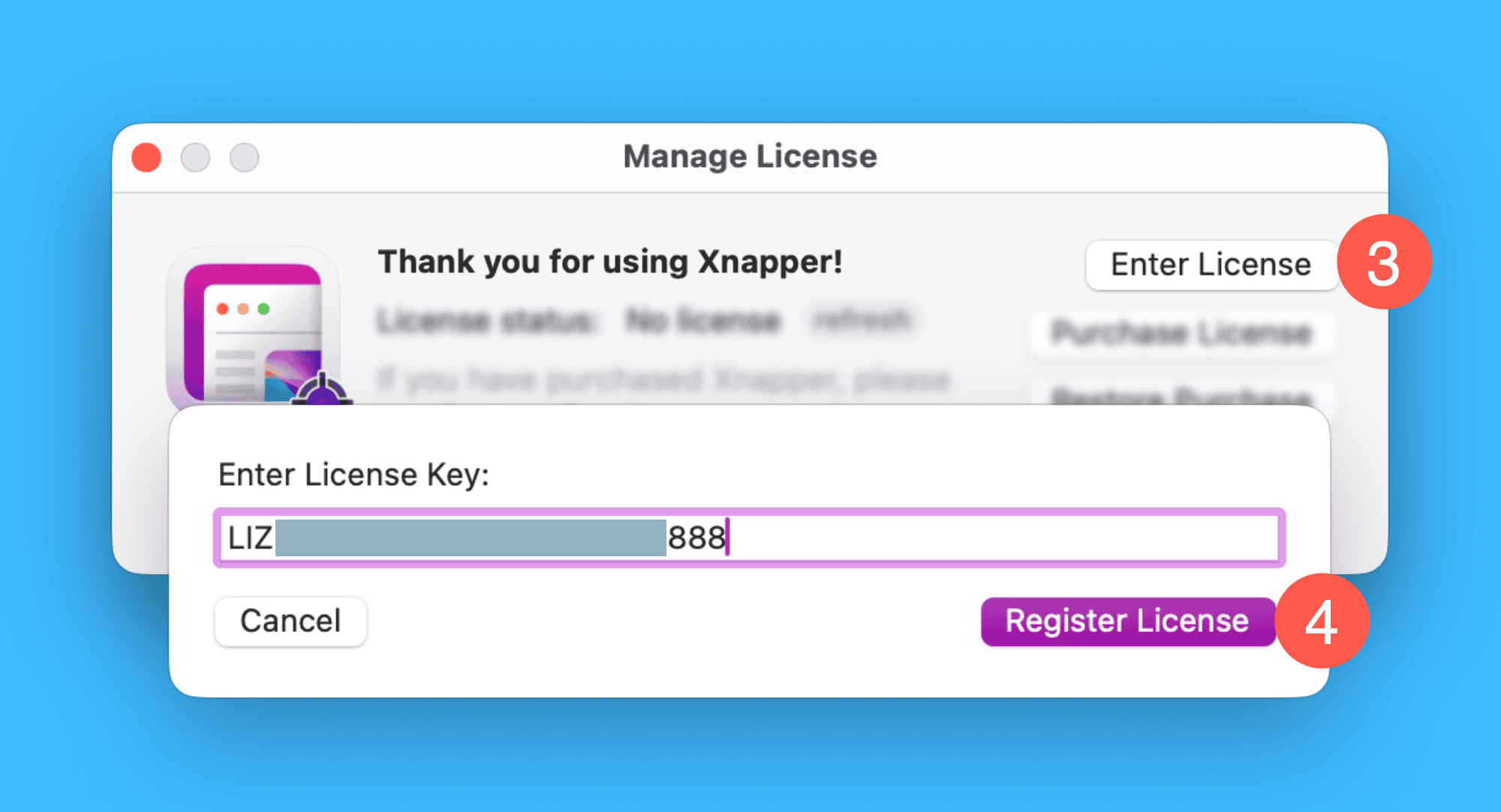 二、在弹窗中点击「Enter License」,粘贴激活码后点击「Register License」即可完成激活。