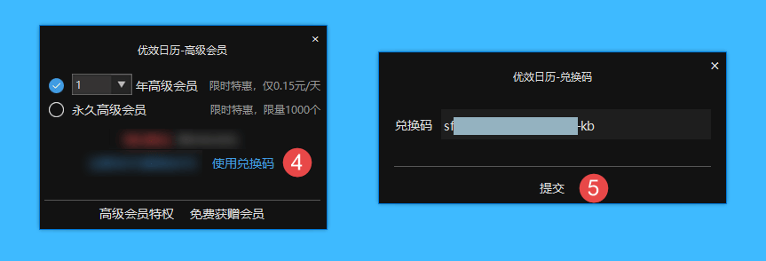 三、在弹窗口中点击「使用兑换码」按钮,并填写兑换码,点击「提交」即可解锁会员功能。