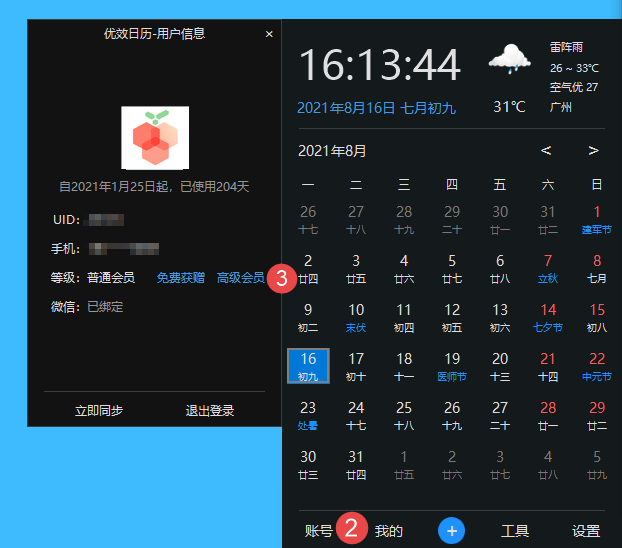 二、注册并登录后,依次点击日历界面「 账号 > 高级会员 」按钮;